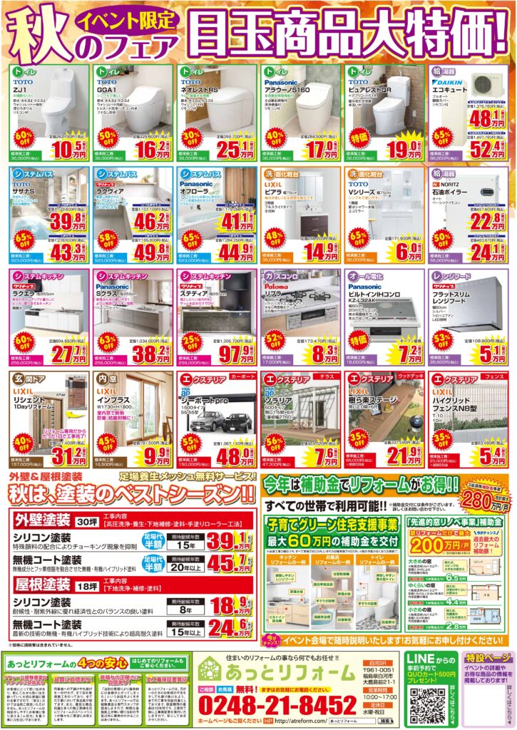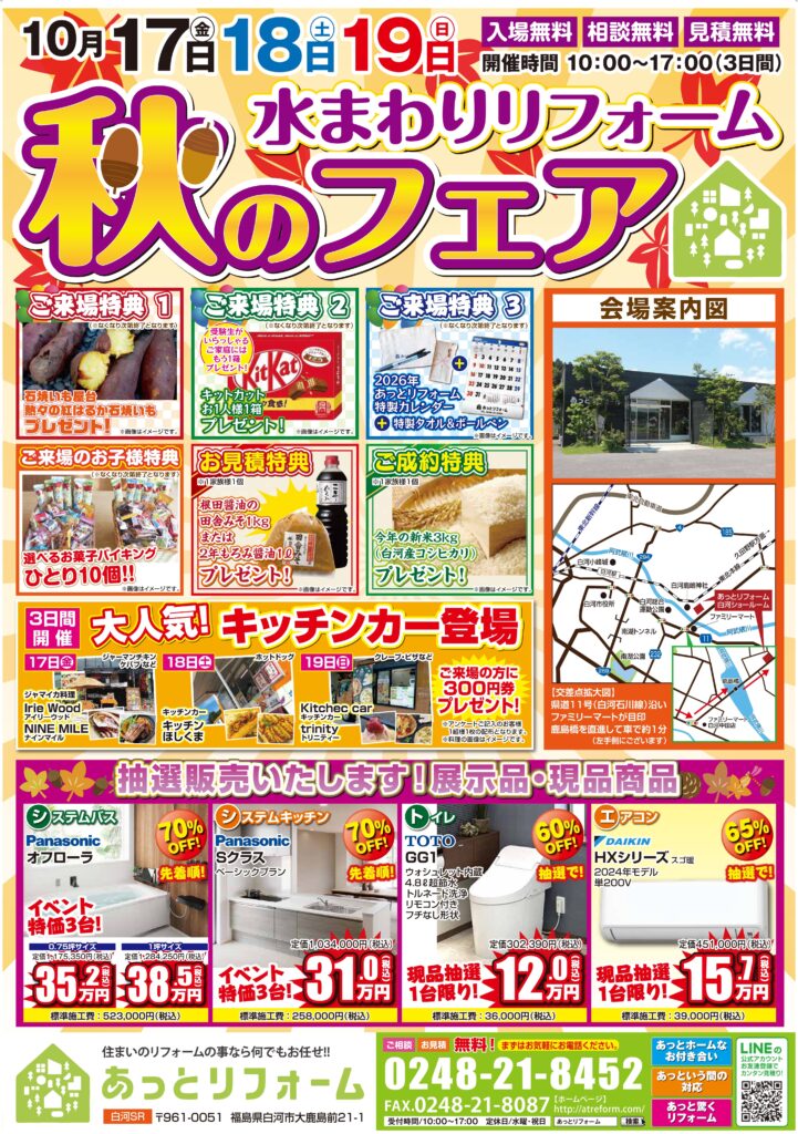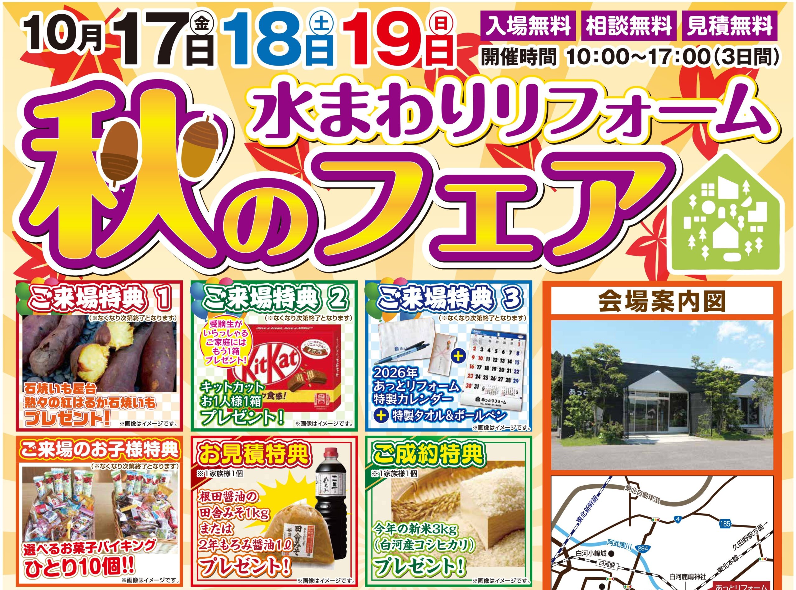 この秋、あっとリフォームでは「水まわりリフォーム 秋のフェア」を開催いたします。